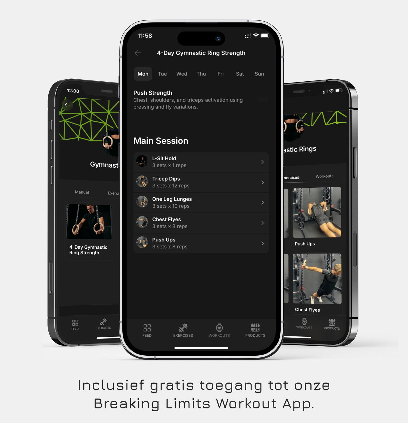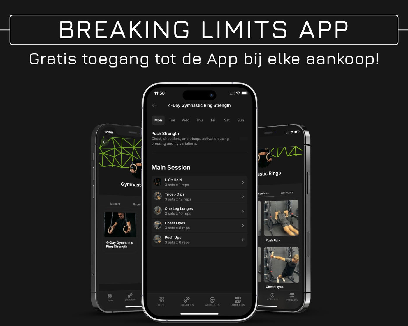 Ja! Naast de meegeleverde handleiding met oefeningen, krijg je toegang tot onze eigen Breaking Limits app. Hier vind je specifieke workouts voor de Gymnastic Rings, zodat je altijd inspiratie hebt en doelgericht kunt trainen.