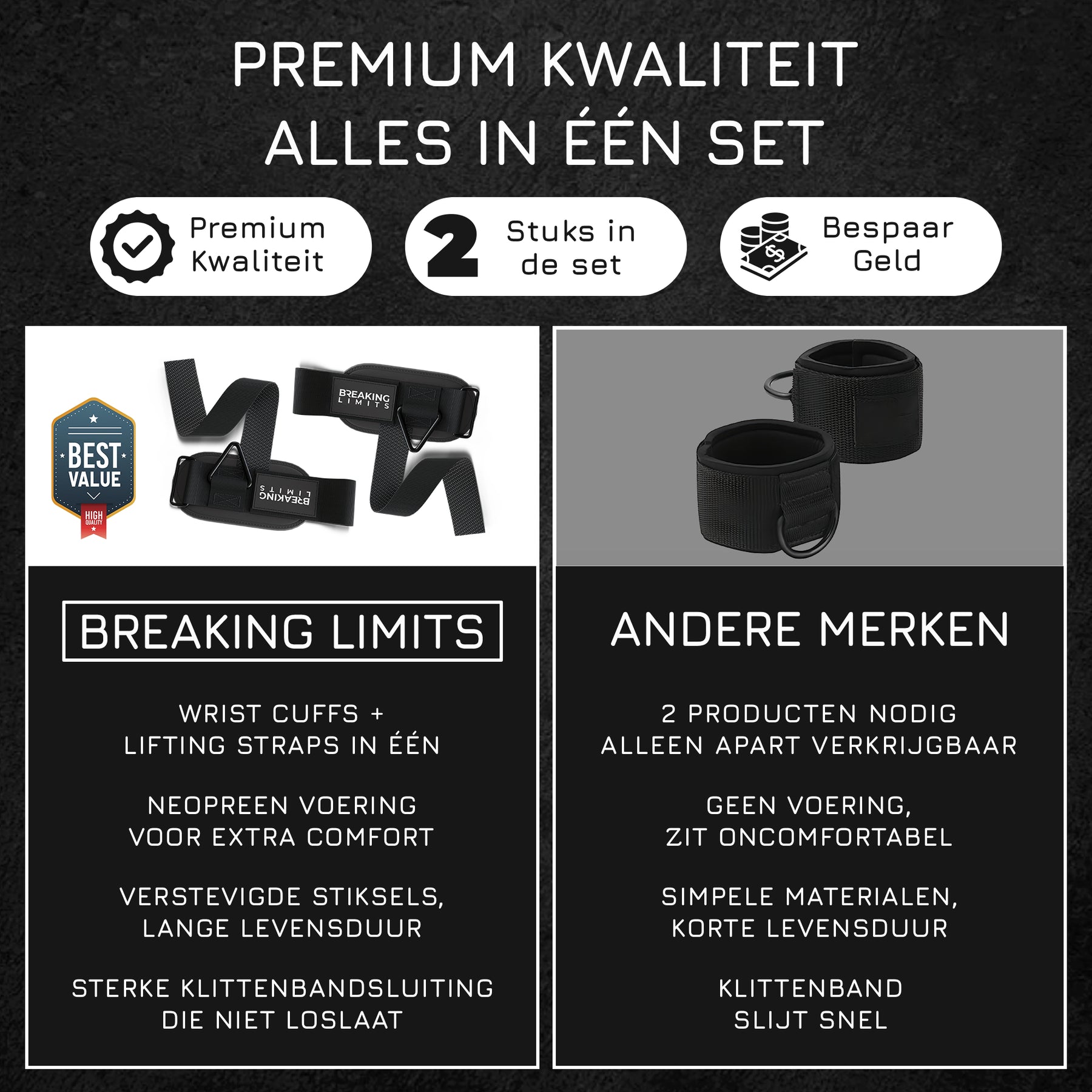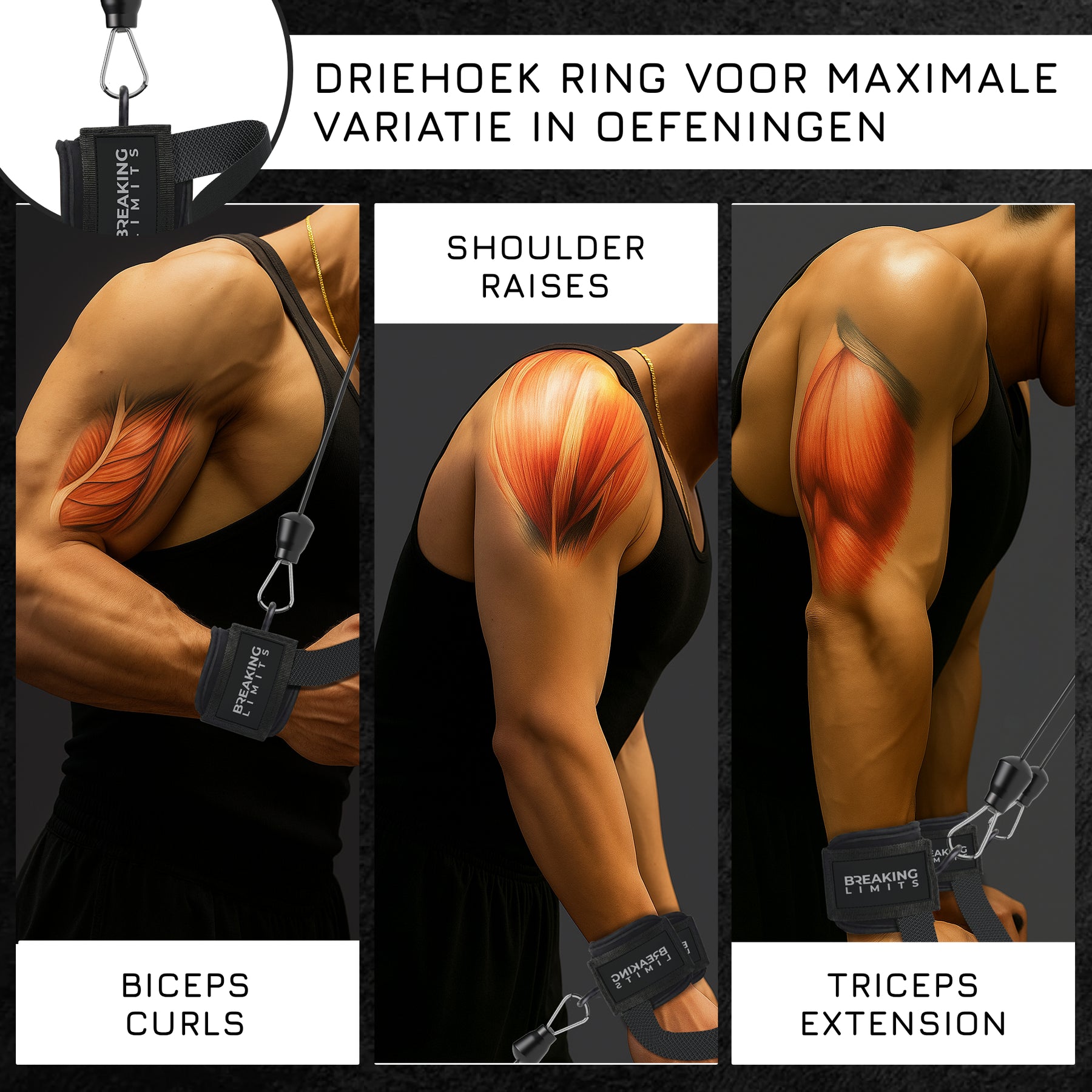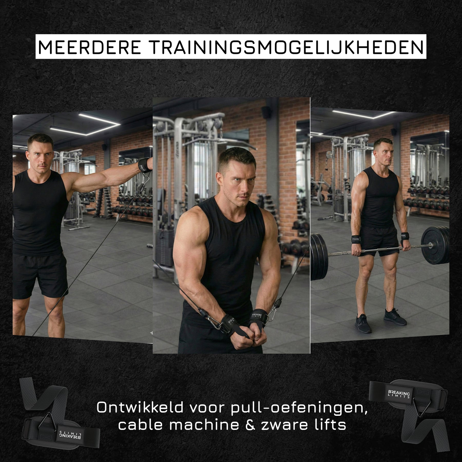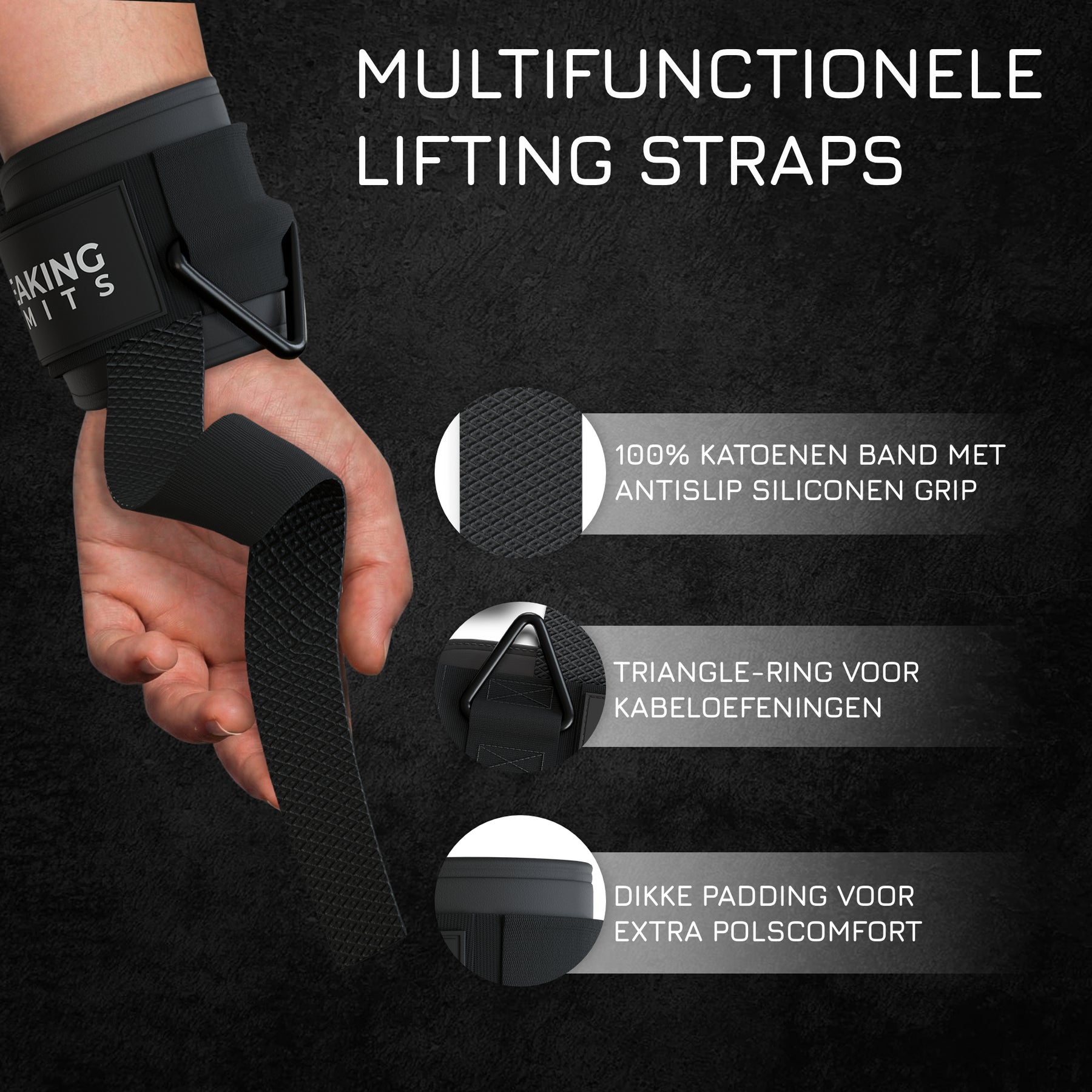 Haal meer uit elke set, train zwaarder en met meer controle. Bestel vandaag nog de Breaking Limits Lifting Straps met Triangle Rings.